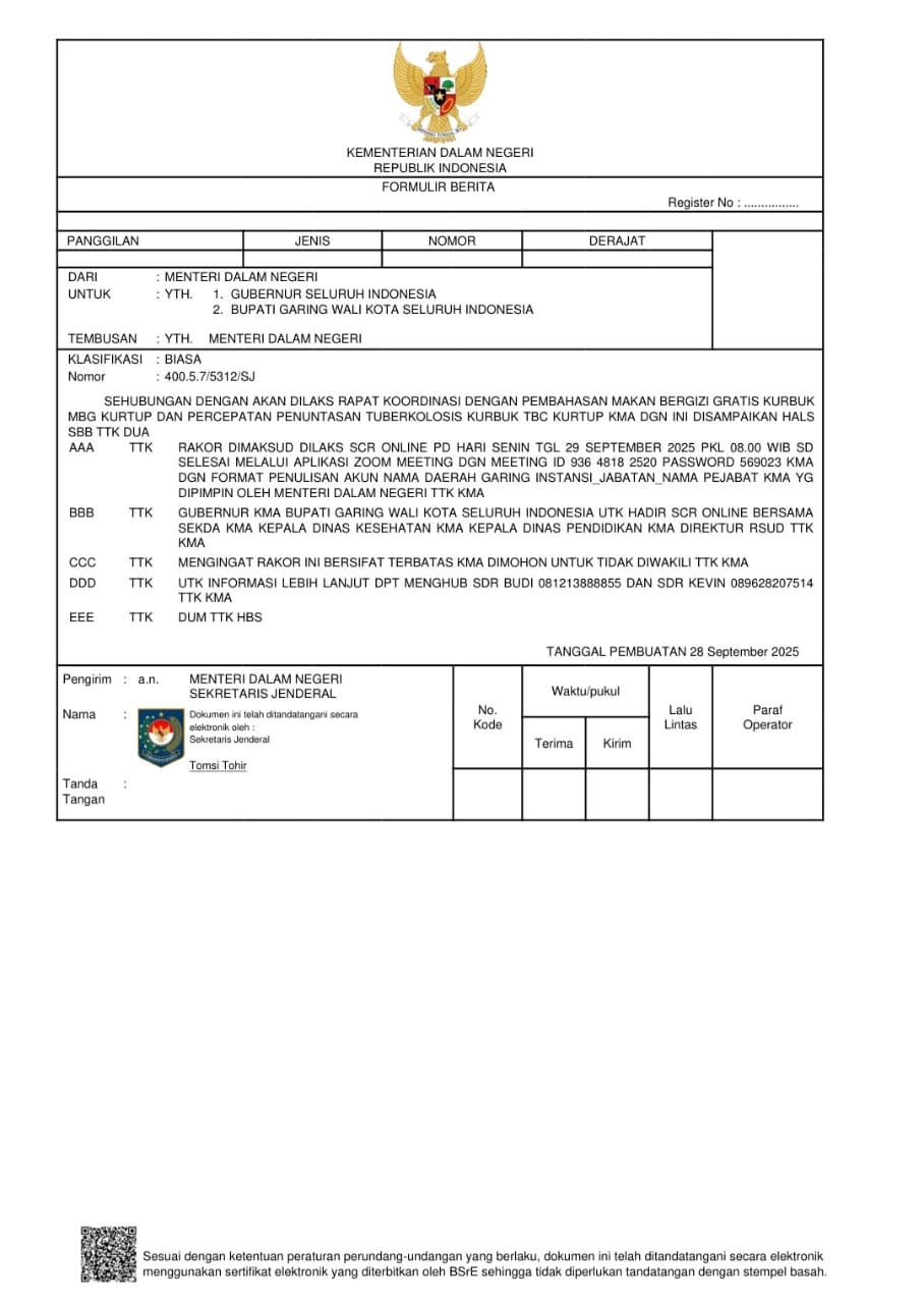 Rapat Koordinasi Dengan Pembahasan Makan Bergizi Gratis (Mbg) Dan Percepatan Penuntasan Tuberkulosis (TBC). Rakor Dimaksud Dilaksanakan Secara Online Pada Hari Senin, 29 September 2025 Pukul 08.00 Wib Sd Selesai Melalui Aplikasi Zoom Meeting