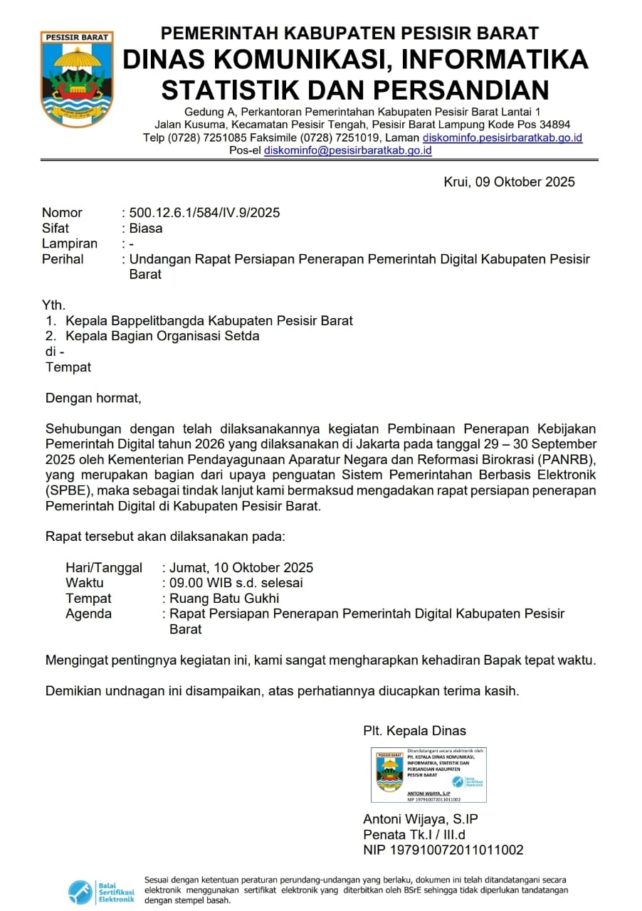 Sehubungan dengan telah dilaksanakannya kegiatan Pembinaan Penerapan Kebijakan Pemerintah Digital tahun 2026 yang dilaksanakan di Jakarta pada tanggal 29 – 30 September 2025 oleh Kementerian Pendayagunaan Aparatur Negara dan Reformasi Birokrasi (PANRB), yang merupakan bagian dari upaya penguatan Sistem Pemerintahan Berbasis Elektronik (SPBE), maka sebagai tindak lanjut kami bermaksud mengadakan rapat persiapan penerapan Pemerintah Digital di Kabupaten Pesisir Barat.