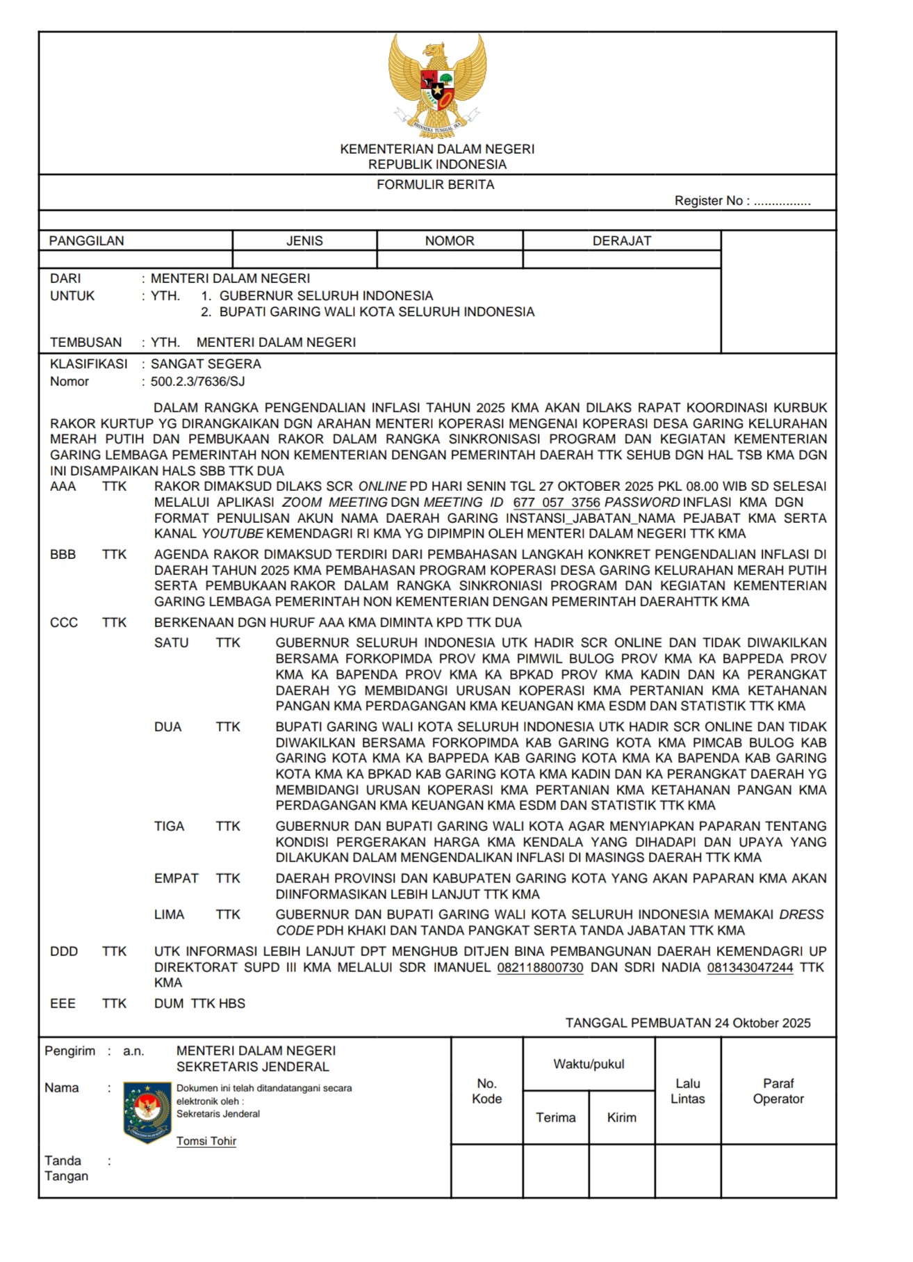 DALAM RANGKA PENGENDALIAN INFLASI TAHUN 2025 KMA AKAN DILAKS RAPAT KOORDINASI KURBUK RAKOR KURTUP YG DIRANGKAIKAN DGN ARAHAN MENTERI KOPERASI MENGENAI KOPERASI DESA GARING KELURAHAN MERAH PUTIH DAN PEMBUKAAN RAKOR DALAM RANGKA SINKRONISASI PROGRAM DAN KEGIATAN KEMENTERIAN GARING LEMBAGA PEMERINTAH NON KEMENTERIAN DENGAN PEMERINTAH DAERAH