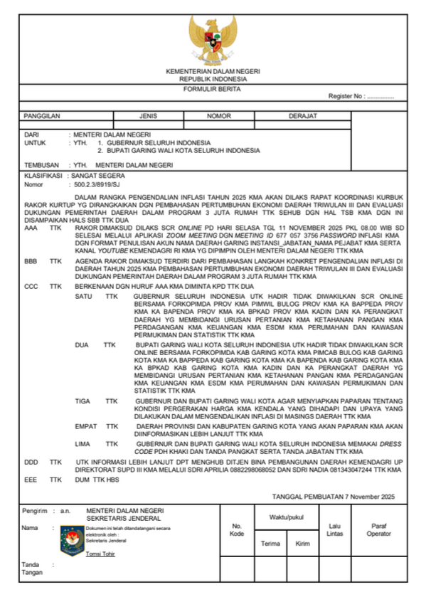 DALAM RANGKA PENGENDALIAN INFLASI TAHUN 2025 KMA AKAN DILAKS RAPAT KOORDINASI KURBUK RAKOR KURTUP YG DIRANGKAIKAN DGN PEMBAHASAN PERTUMBUHAN EKONOMI DAERAH TRIWULAN III DAN EVALUASI DUKUNGAN PEMERINTAH DAERAH DALAM PROGRAM 3 JUTA RUMAH TTK SEHUB DGN HAL TSB KMA