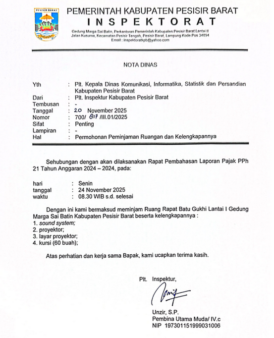 Jika ruang rapat sudah dibooking namun terdapat agenda yang melibatkan pimpinan tinggi secara langsung, kami berhak membatalkan pemesanan tersebut. Penggunaan ruangan diprioritaskan untuk perangkat daerah di lingkungan Pemerintah Kabupaten Pesisir Barat. Stakeholder luar dapat menggunakan ruangan atas permohonan dan disetujui oleh pimpinan kami. Untuk pertanyaan lebih lanjut atau bantuan dalam proses booking, jangan ragu untuk Kontak ALiKA.